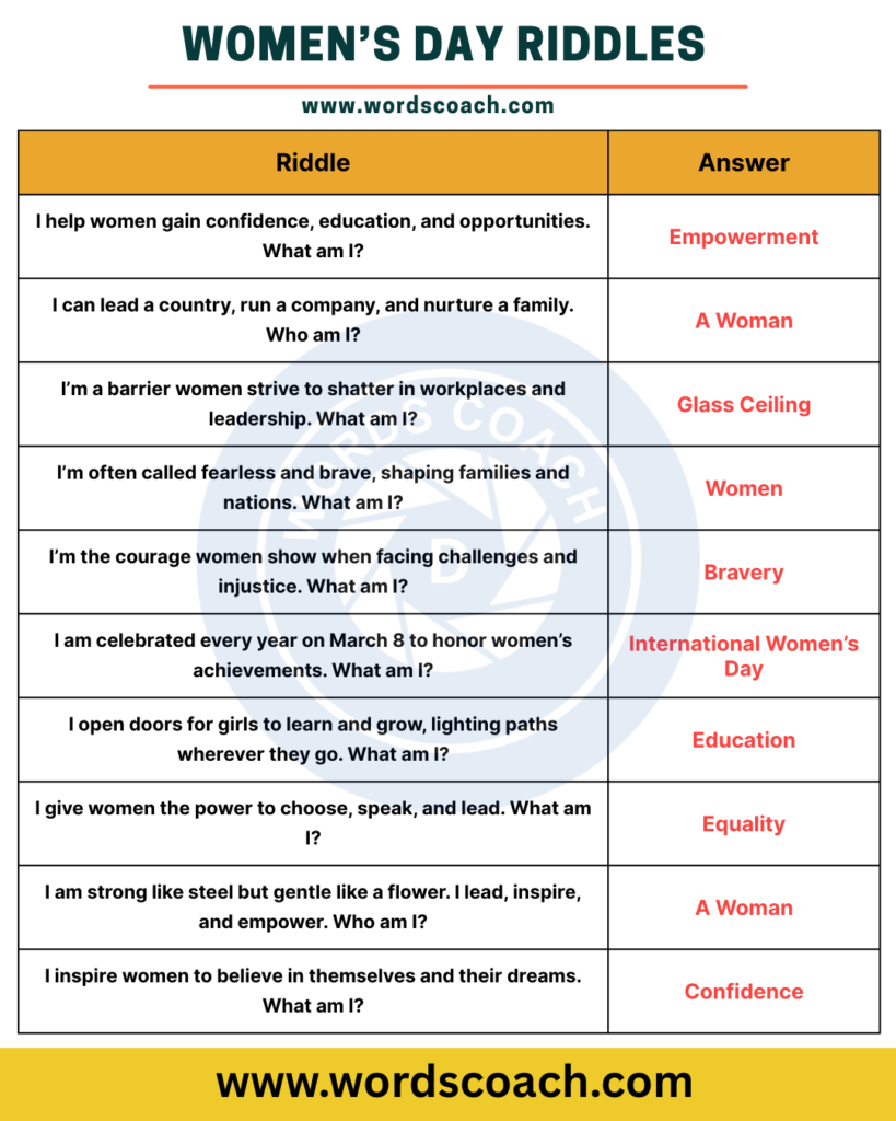 Whether you use them in classrooms, social media posts, or Women’s Day events, these riddles help highlight the strength, courage, and achievements of women worldwide.