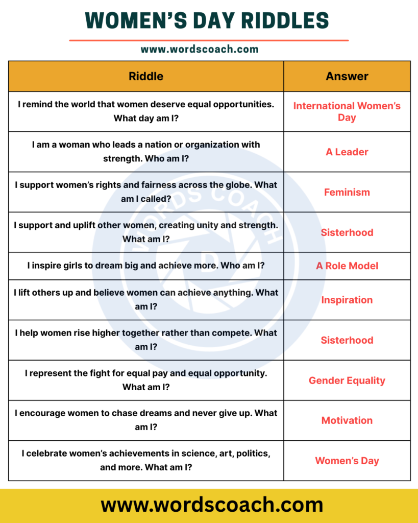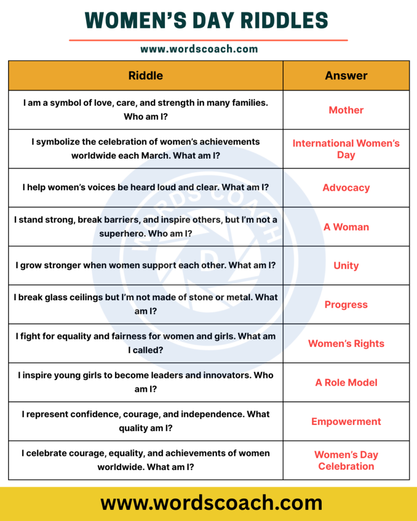 One creative and engaging way to celebrate this special day is through Women’s Day riddles. Riddles are not only entertaining but also a great way to spark conversations about women’s empowerment, equality, and achievements.